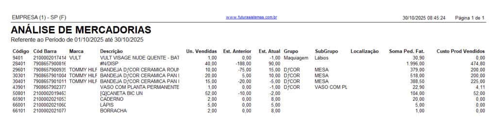 Como funciona: O relatório de Análise de Mercadoria foi desenvolvido com o objetivo de promover a análise dos produtos vendidos dentro do período selecionado, com base nas informações de estoque e cadastro.