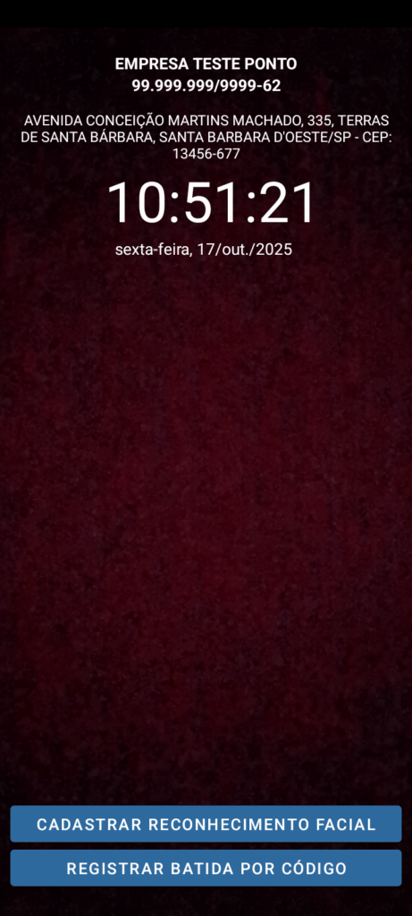 Além disso, a tela de batida foi atualizada para exibir de forma mais clara a data e horário atual, bem como as informações da empresa.