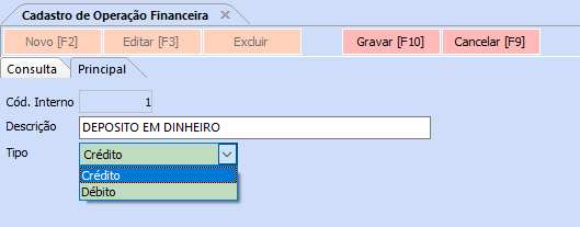 Caminho: Cadastros>Financeiro>Operação Financeira