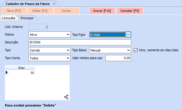 Para cadastrar um novo prazo fatura acesse o caminho acima, clique em F2 Novo e o sistema abrirá a tela abaixo: