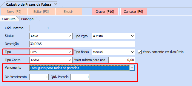 Tipo: Informe se o prazo fatura será contado em dias corridos ou fixo.