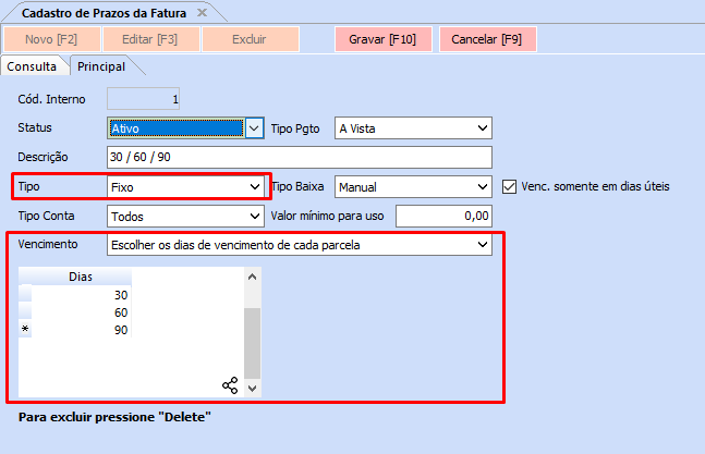 Dias: É necessário digitar na tabela a quantidade de dias de acordo com prazo fatura a ser cadastrado, como mostra a imagem acima.