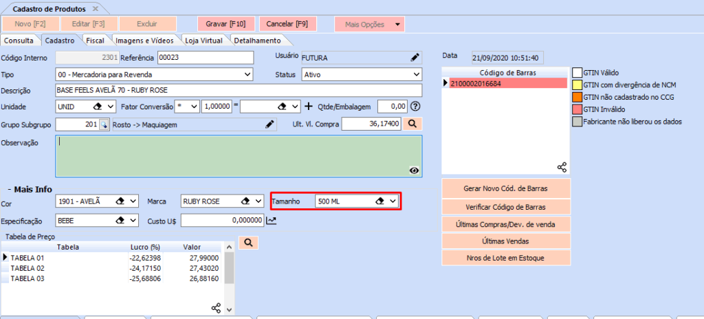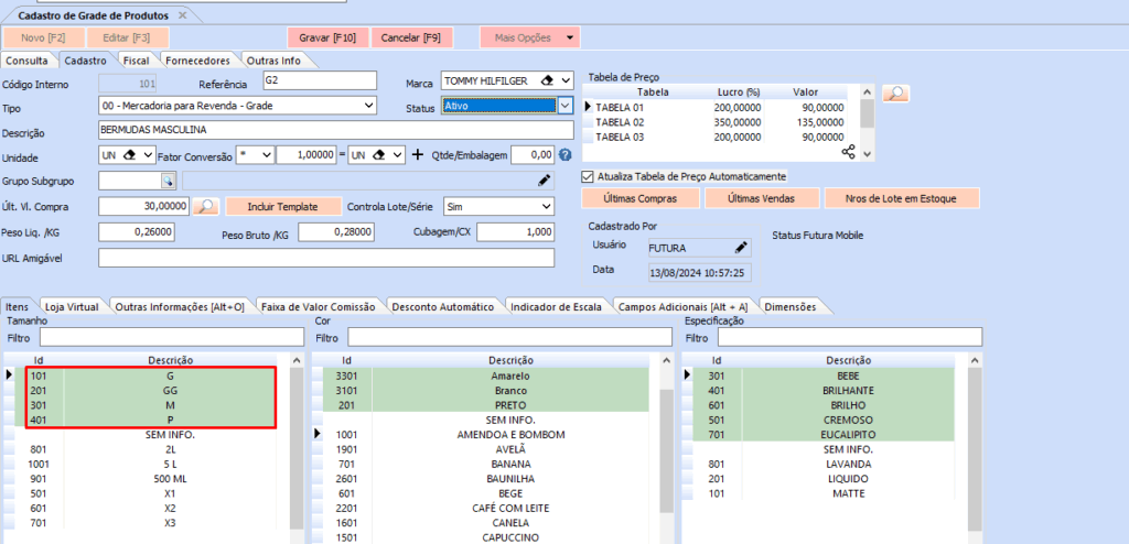 Tamanho referenciado na Grade de Produtos após cadastrar: