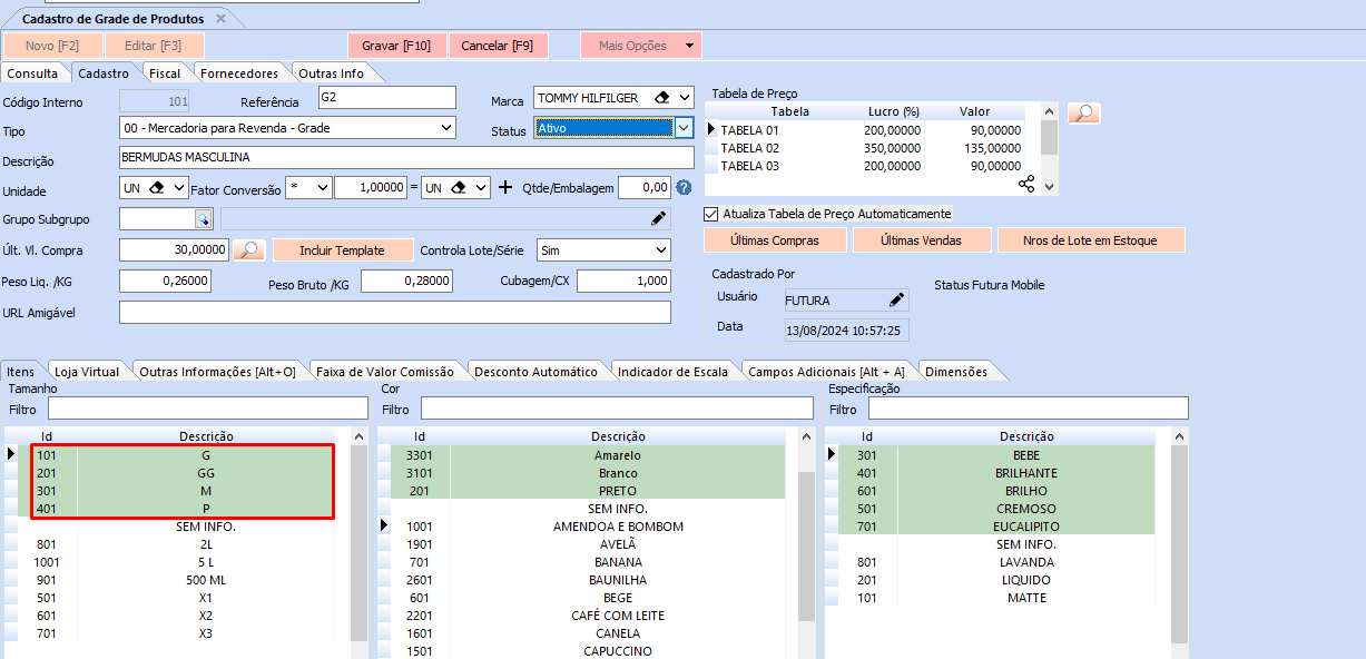 Tamanho referenciado na Grade de Produtos após cadastrar: