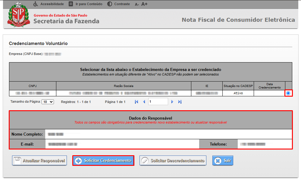 - Informe os dados do responsável pelo estabelecimento (nome, e-mail e telefone). Esses dados serão utilizados pela SEFAZ-SP para contato, se necessário.