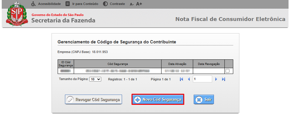 Ao acessar, será possível visualizar todos os códigos já gerados (caso possua). Caso ainda não possua um, clique em “Novo Cód Segurança” para gerar o primeiro CSC.