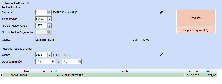 O sistema irá juntar os pedidos mantendo as principais informações do pedido principal conforme mostra imagem abaixo: