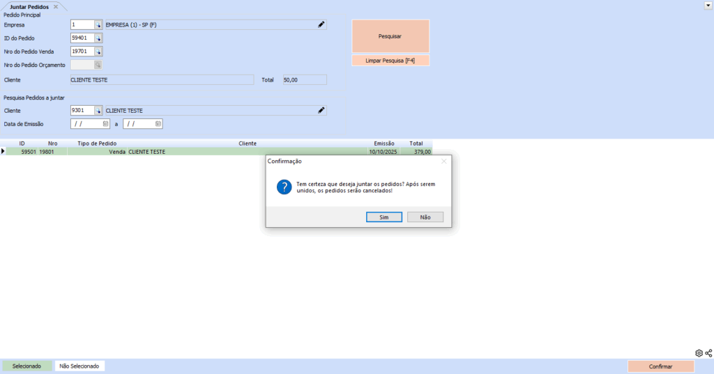 Pesquisa Pedidos a Juntar: Informe o cliente do seu pedido principal e clique em Pesquisar e, o sistema ira trazer todos os pedidos do cliente pesquisado. Basta selecionar os que deseja juntar ao principal e clicar em Confirmar.