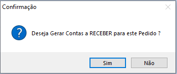 Clique em SIM, defina o tipo de cobrança e a conta corrente que irá gerar a conta a RECEBER com o valor Total que foi inserido e o sistema apresentará a segunda validação abaixo: