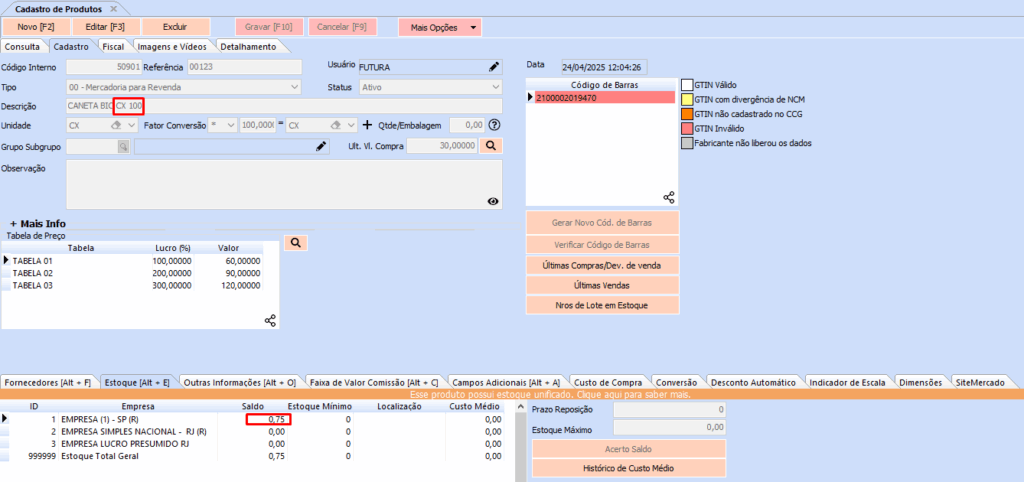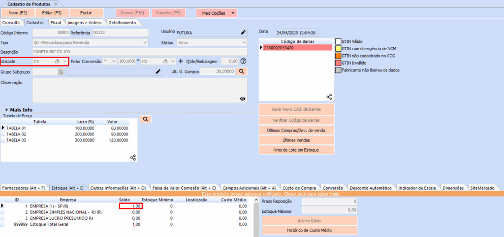 E aqui um exemplo de apenas uma caixa com 100 unidades, portanto seu estoque fica com o saldo de 1 que significa uma caixa que contem 100 unidades unitária desta caneta.