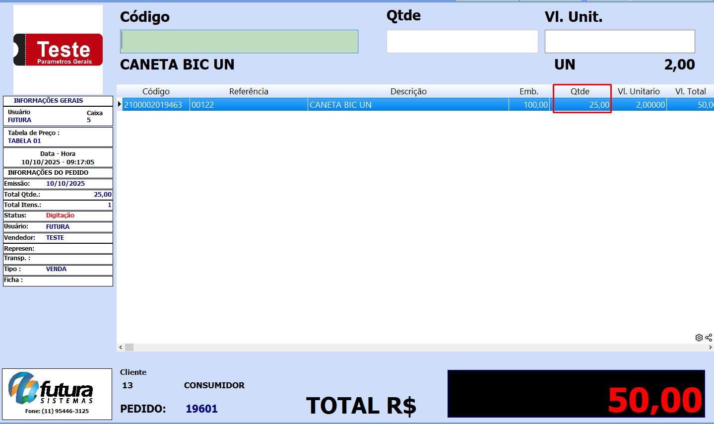 Neste exemplo iremos utilizar o Futura PDV para realizar uma venda com este produto para visualizarmos a movimentação do estoque.