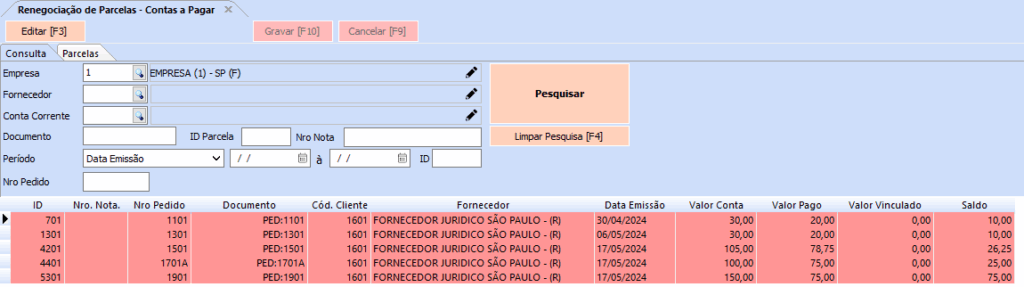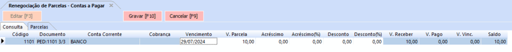 Caminho: Contas a Pagar>Renegociação de Parcelas
