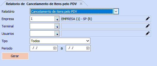 Como funciona: A tela de relatório de Cancelamento de Itens pelo PDV, foi desenvolvida com o objetivo de listar por terminal e usuário, as informações de produtos excluídos durante uma venda ou de pedidos que foram cancelados, todos estes efetuados no sistema PDV.