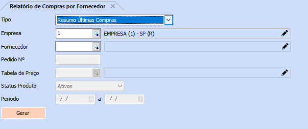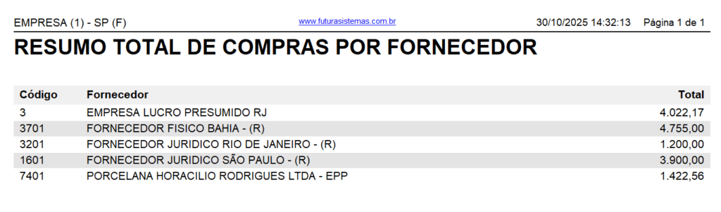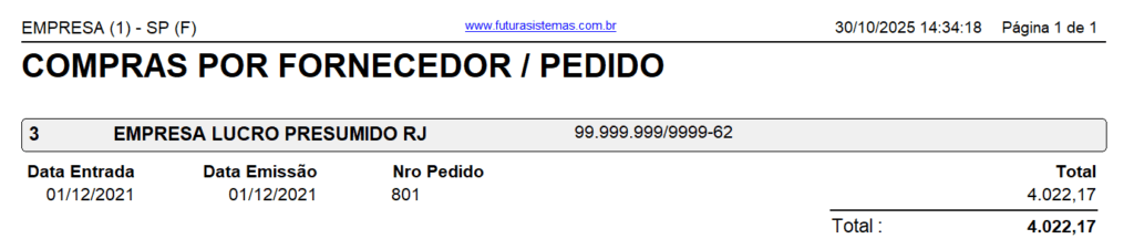 Este relatório exibirá a soma total de pedidos de compra com status Baixados ou Faturados de cada fornecedor, em um determinado período.