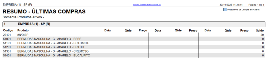 Este relatório mostrará informações de todos os produtos de um determinado fornecedor, suas últimas três compras e saldo atual em estoque. Para geração deste modelo, é obrigatório indicar o cadastro de Fornecedor nos filtros. Caso possua pedidos de compras em aberto, o relatório trará a informação destacado na cor azul.