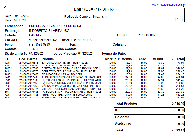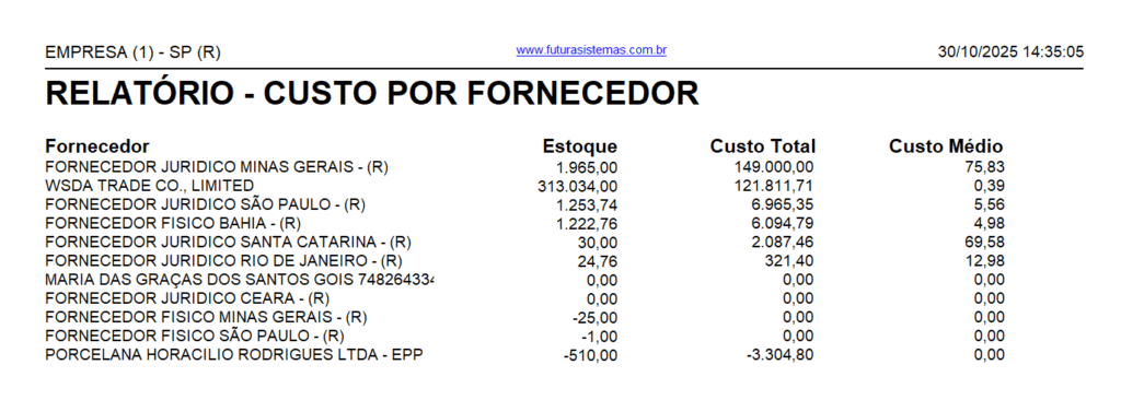 Este modelo de relatório traz a quantidade total de saldo em estoque dos produtos relacionados ao determinado fornecedor, assim como o custo total e custo médio.