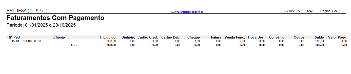 Caminho: Relatórios>Faturamento>Pedidos Faturados com Pagamento