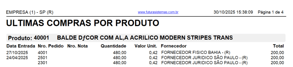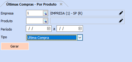 Como funciona: A tela de relatório de últimas compras por produto foi desenvolvida com o objetivo de gerar informações sobre as últimas compras. Diferente dos demais relatórios que apresentam as compras por fornecedor, este modelo é agrupado por Produto.
