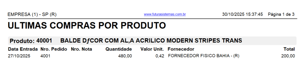 Exibe as últimas três compras realizadas de um produto, com informações sobre o pedido e fornecedores.