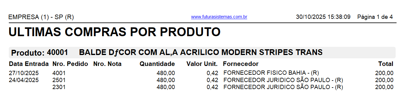 Exibe as últimas três compras realizadas de um produto, com informações sobre o pedido e fornecedores.