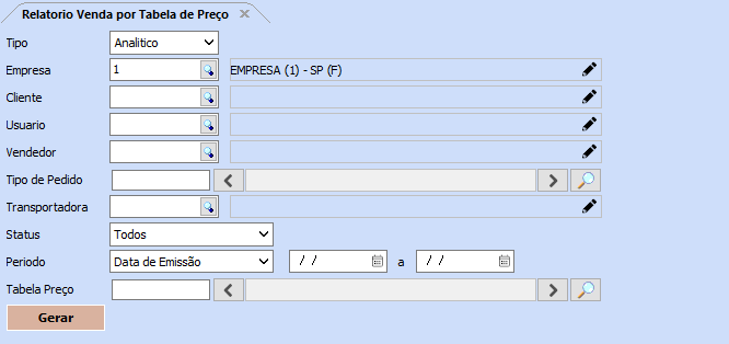 Lista as informações dos pedidos de vendas efetuados separados por tabela de preço de forma resumida. Para gerar esse relatório, é obrigatório preencher os filtros de tipo de pedido e tabela de preço.