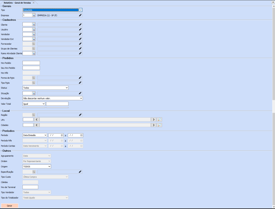 Traz a listagem dos Pedidos de Venda agrupados por Data, podendo escolher entre os filtros de Data de Emissão ou Data de Saída e diferentes Status.