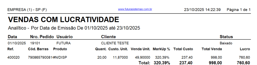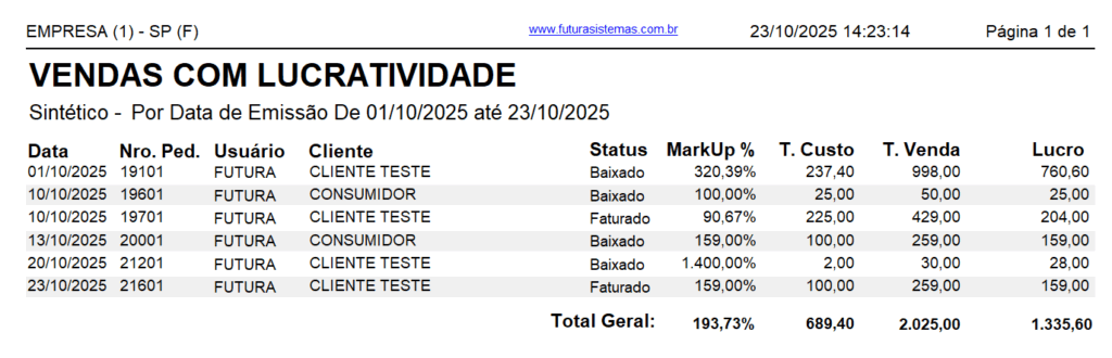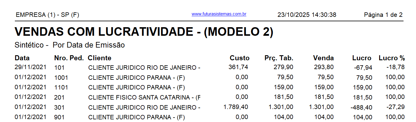 Exibe a listagem dos Pedidos de Venda com as informações resumidas e o lucro obtido. O cálculo do relatório pode ser dado de diferentes formas quando utilizado o filtroTipo Custo que é específico para este modelo.