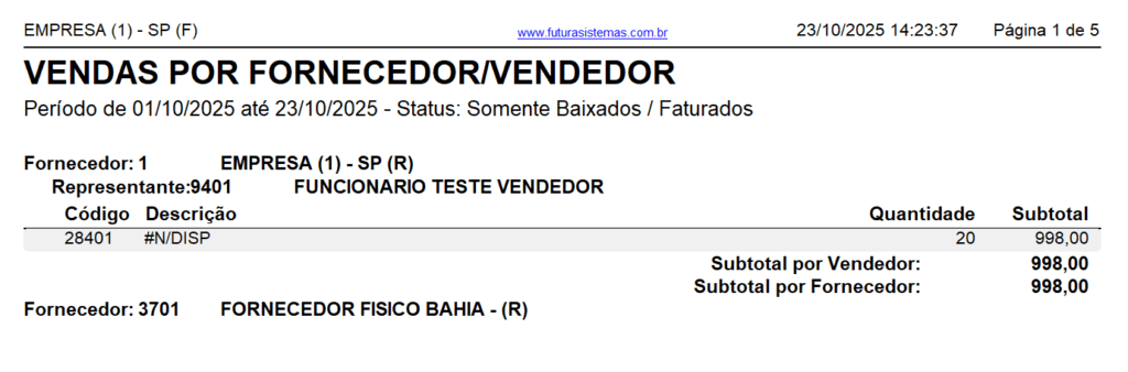 Retorna as informações de vendas relacionando Fornecedores e Vendedores, ou seja, este modelo irá informar o quanto o Vendedor vendeu de produtos de determinado Fornecedor.