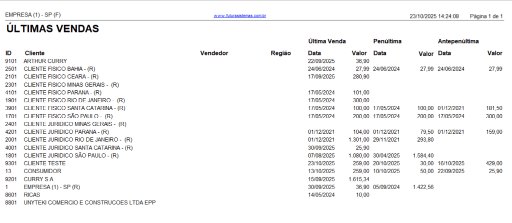 Relatório que traz as últimas três vendas realizadas pelo Cliente, suas respectivas datas e valores, sendo possível filtrar os clientes também por Região.