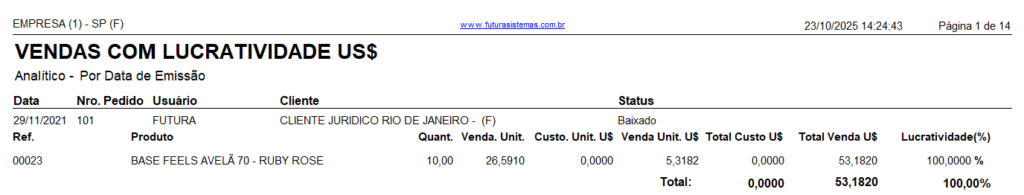 Exibe a listagem dos Pedidos de Venda com as informações detalhadas dos produtos vendidos e o lucro obtido. Por ser um modelo que calcula o valor em dólar, é obrigatório o preenchimento do campo Câmbio na tela do relatórioe o campo Custo U$ no Cadastro do Produto.
