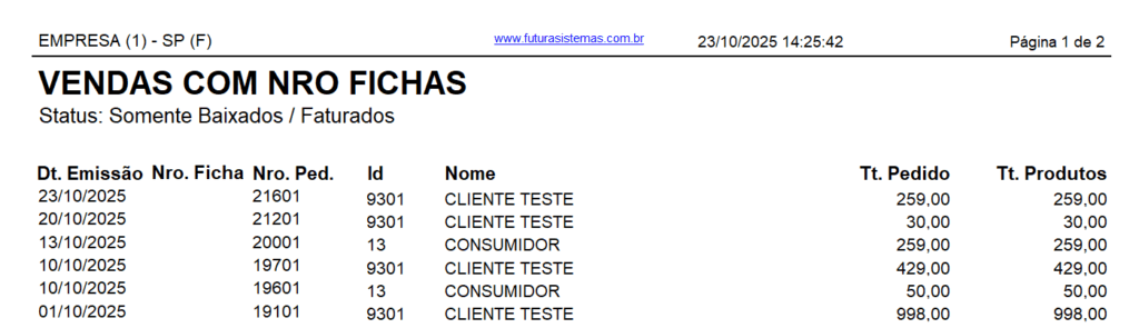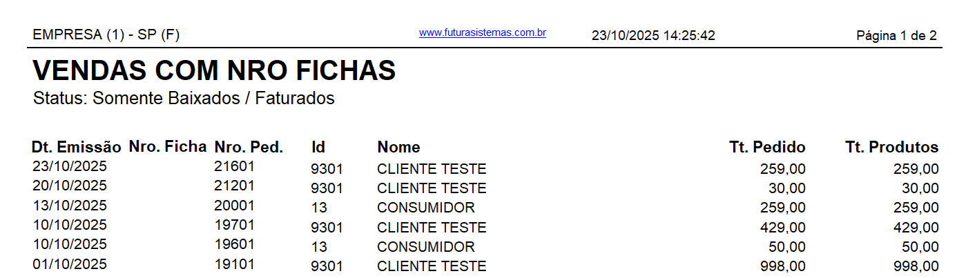 Relaciona as vendas efetuadas em um determinado período. O diferencial deste relatório é que ele possui o campo Nro. Ficha, utilizado nas vendas do PDV.