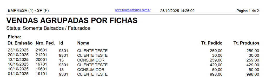 Relaciona as vendas efetuadas em um determinado período, como no relatório acima, porém agrupando os pedidos por Nro. Ficha.