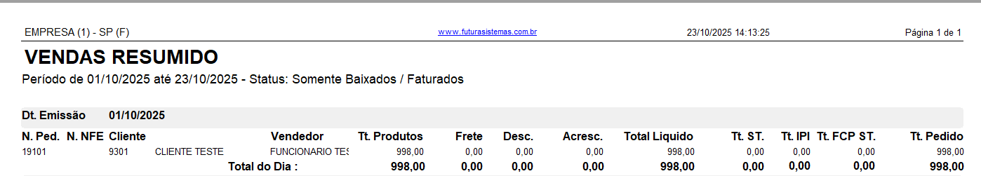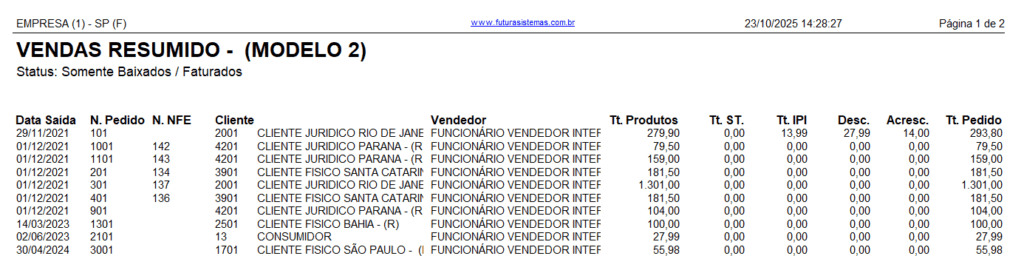 Este modelo traz a listagem dos Pedidos de Venda realizados. Diferente do Resumido, o mesmo apresenta um layout mais conciso sem agrupamentos de data.