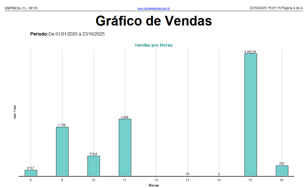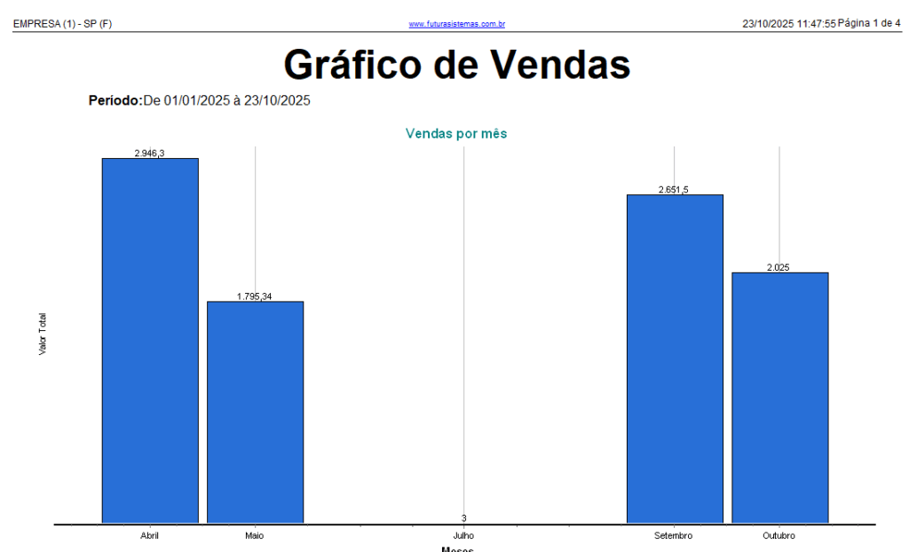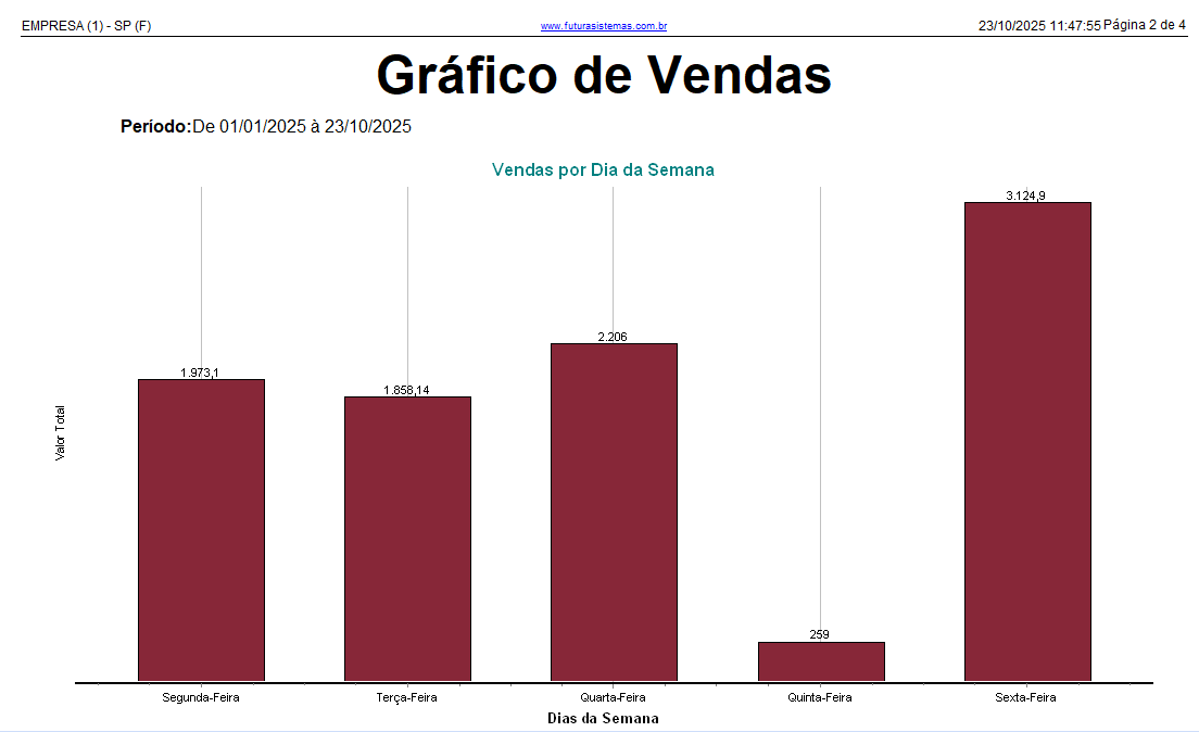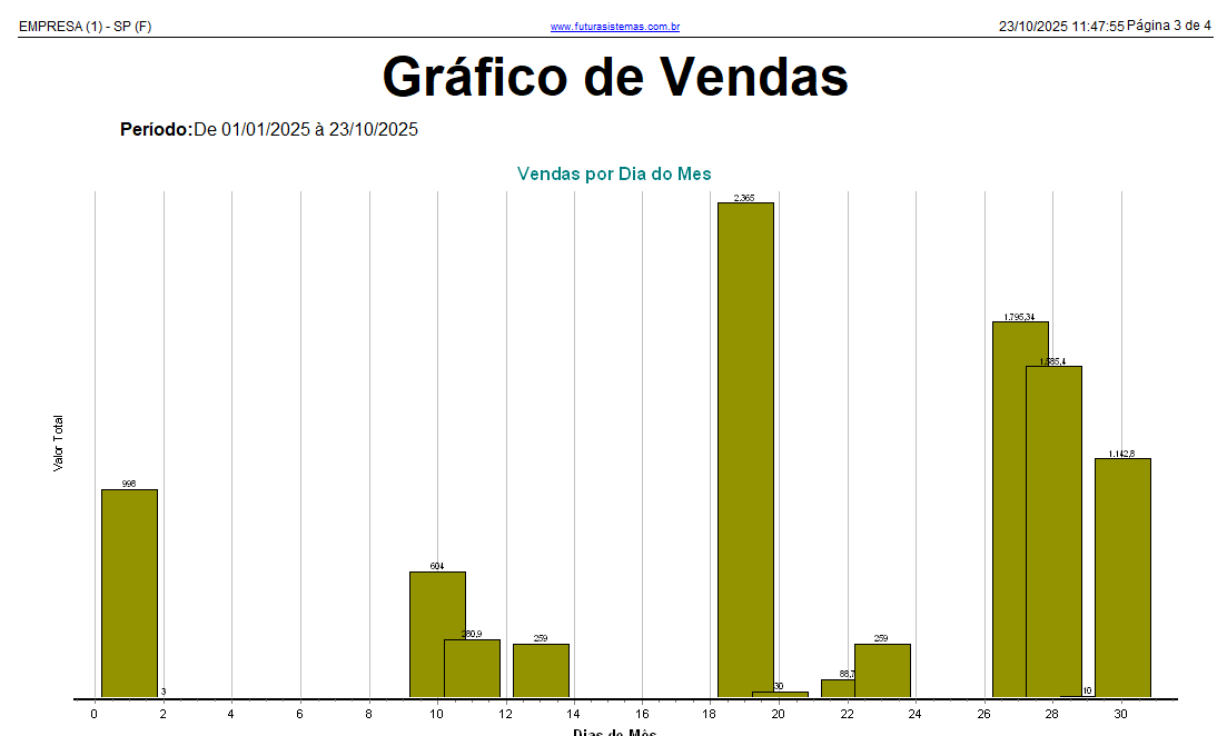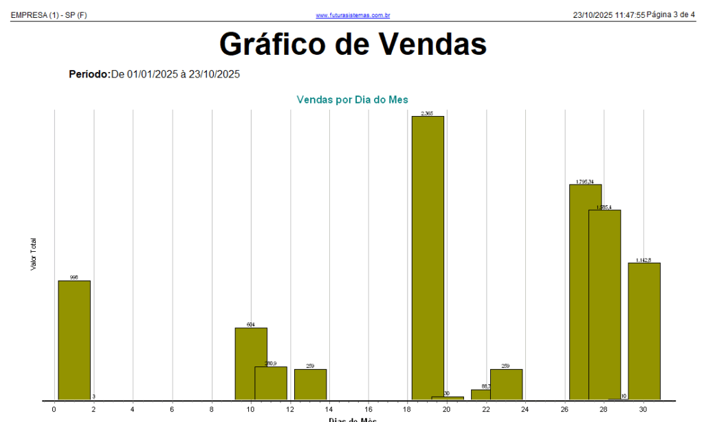 Este relatório disponibiliza gráficos das vendas realizadas, que podem ser organizados por Vendas por mês, Vendas por Dia da Semana, Vendas por Dia do Mês, Vendas por Horas. É necessário inserir um Período para gerar o relatório.