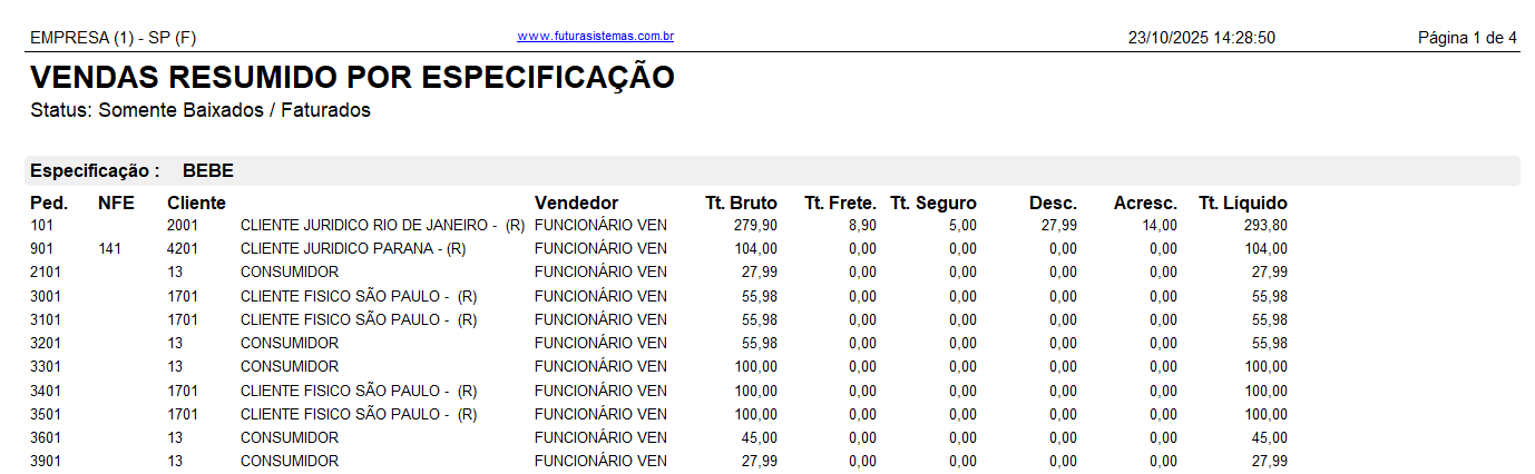 Exibe os detalhes das vendas separados por Especificação do produto. Para isso, é necessário que o produto vendido possua uma Especificação indicada em seu cadastro, caso contrário retornará como “Sem Especificação”.