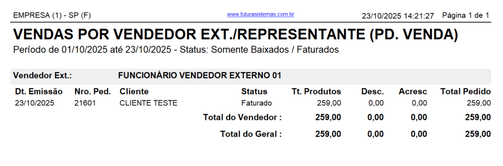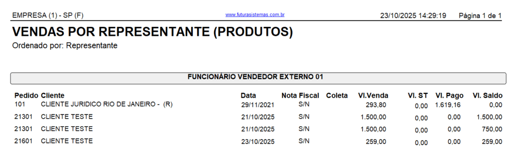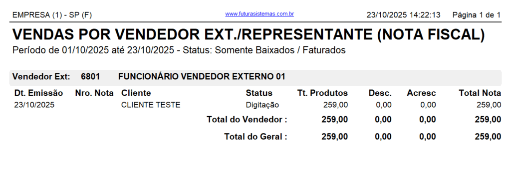 Lista as vendas realizadas com base nas notas fiscais e agrupados por Vendedor Externo.