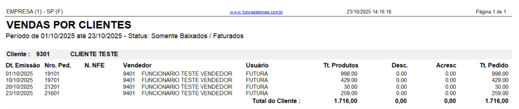 Lista os Pedidos de Venda efetuados agrupados por Cliente. É possível visualizar todos os clientes no relatório, ou indicar um específico no filtro que localiza-se na tela principal.