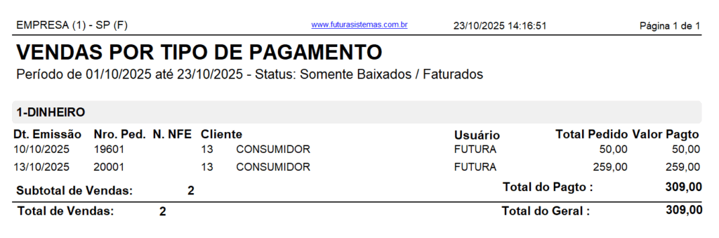Lista os Pedidos de Venda agrupados conforme seu respectivo Tipo de Pagamento. Para obter essas informações, é necessário que o pedido tenha sido concluído no PDV.