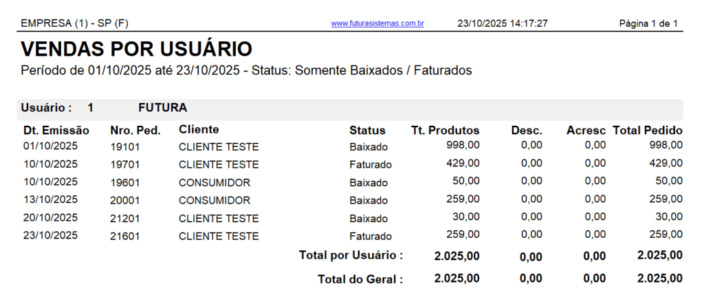 Lista os Pedidos de Venda agrupados por Usuário do sistema.