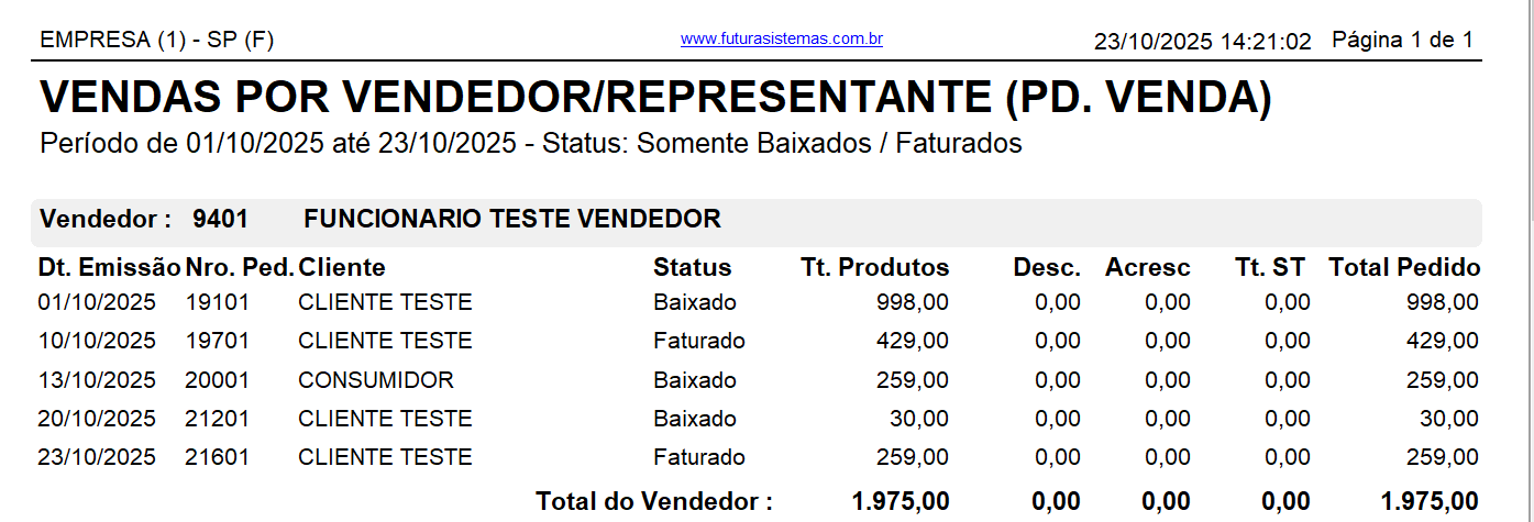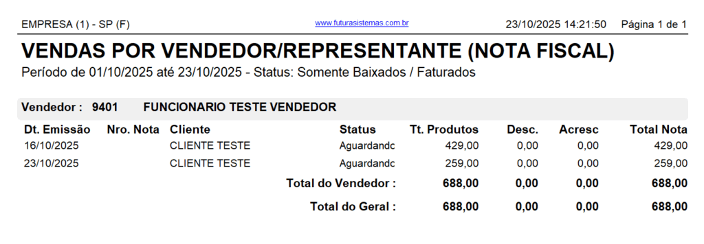 Lista as vendas realizadas com base nas notas fiscais e agrupados por Vendedor.