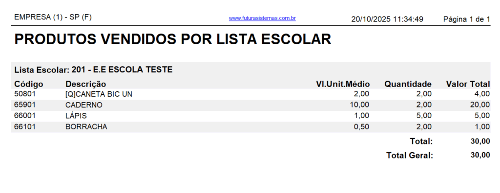 Lista todos os produtos vendidos no determinado período separados por lista escolar, trazendo Vl. Unitário Médio, Quantidade e o Valor Total.