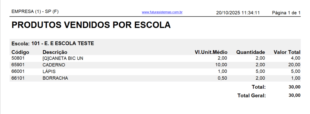 Lista todos os produtos vendidos no determinado período separados por escola, trazendo Vl. Unitário Médio, Quantidade e o Valor Total.