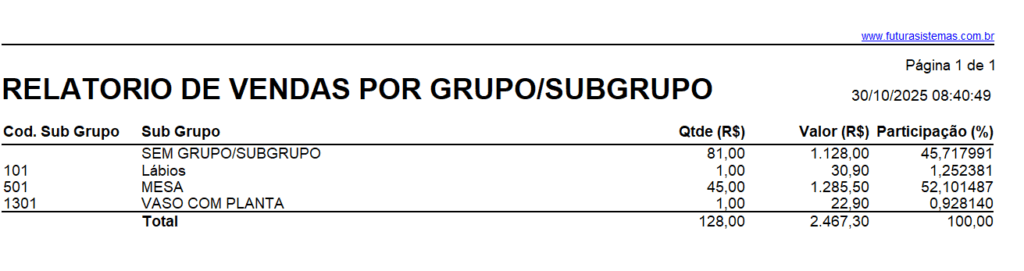 Como funciona: Este relatório foi desenvolvido com objetivo de exibir a quantidade vendida de um determinado Sub Grupo de produtos e seu respectivo valor. Através dele, é possível visualizar a porcentagem de participação de cada Sub Grupo no total das vendas.
