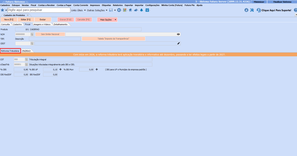 Na tela de cadastro de produtos foi implementado a Aba – REFORMA TRIBUTÁRIA