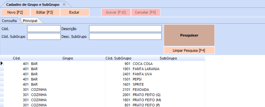 Para que cada impressão seja enviada à impressora correspondente, é necessário configurar corretamente os grupos e subgrupos de produtos. Para isso acesse o caminho: Cadastros > Estoque > Grupo/Subgrupo.