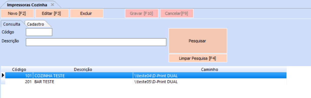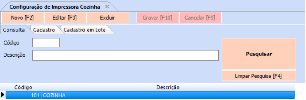 Após a configuração dos caminhos das impressoras, acesse o caminho: Cadastros > Restaurante > Configuração Impressora Cozinha.