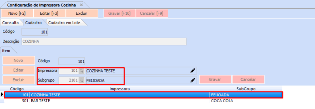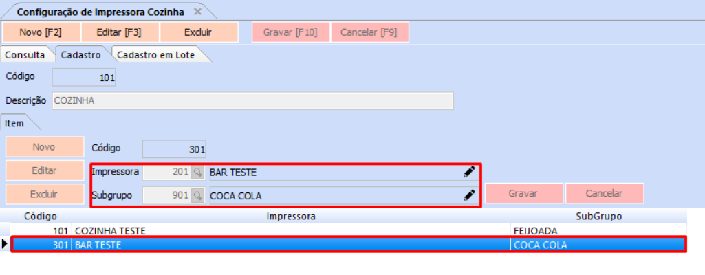No campo Impressora, selecione a impressora desejada (ex.: Cozinha) e, em Subgrupo, informe o subgrupo correspondente. Depois, clique em Gravar.