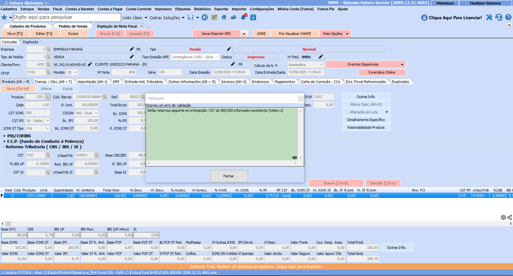 Sefaz retornou seguinte erro:Rejeição: CST do IBS/CBS informado inexistente [nItem:1]
