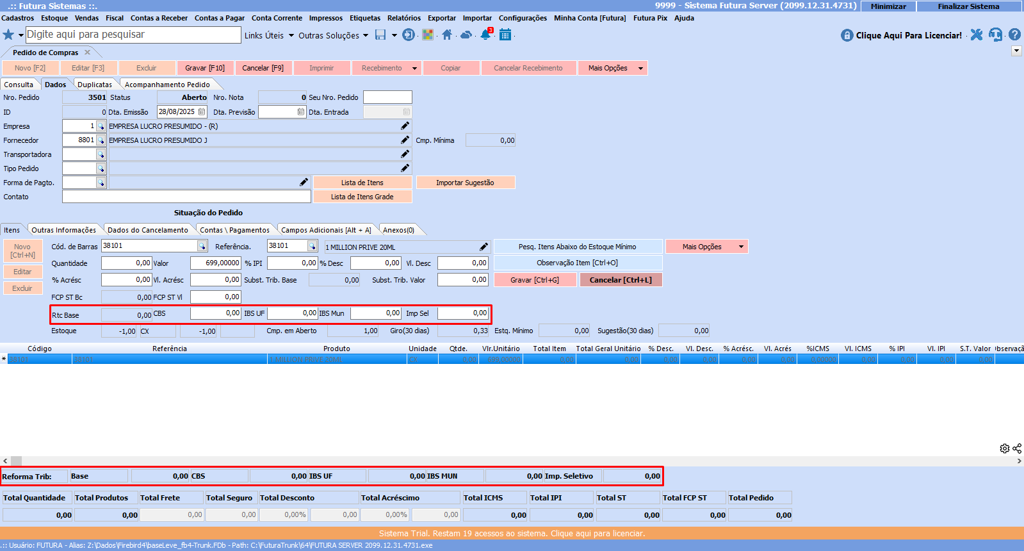 Na tela do pedido de compra foi inserido campos referente a Reforma Tributaria: RTC BASE, CBS, IBS UF, IBS MUN e IMP SEL.
