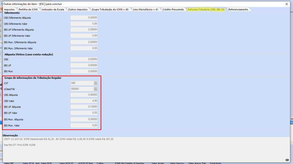 Dentro da aba de “Outras Info” do item, na parte da Reforma Tributária o grupo de “Grupo de informações da Tributação Regular” será preenchido automaticamente como padrão o CST 000 e cClassTrib 000001.